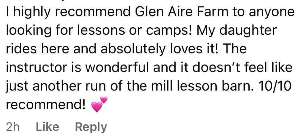 At Glen Aire Farm, we offer a safe, supportive, and fun environment where riders of all ages can learn, grow, and build a lasting connection with horses. Whether you’re brand new to the barn or looking to sharpen your skills, our lesson program is open year-round, with experienced, background-checked instructors who focus on safety, confidence, and horsemanship.